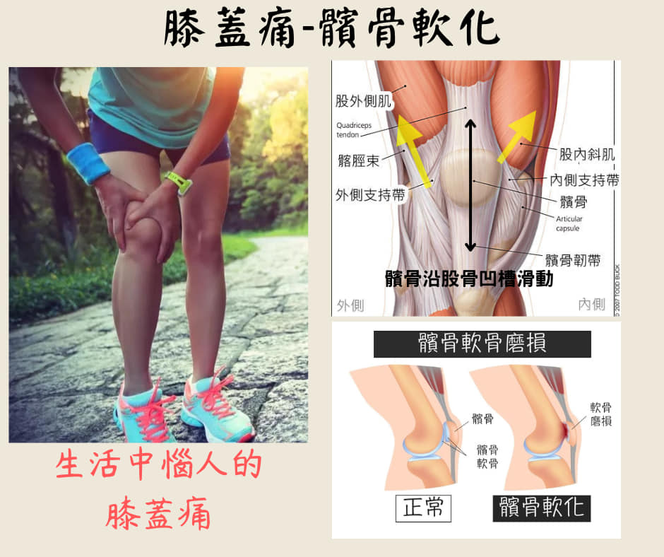 髕骨就是俗稱的膝蓋骨,其功能在於將股四頭肌的力量傳遞到髕骨韌帶而帶動小腿,如果持續受到不當外力影響,就會造成韌帶與軟骨的不平衡,致使髕骨外移或者軟骨受到擠壓、磨損,當軟骨變得柔軟且容易變形、無法承受體重所給予的力量時,就會引起發炎、疼痛,就是所謂的「髕骨軟化症」。